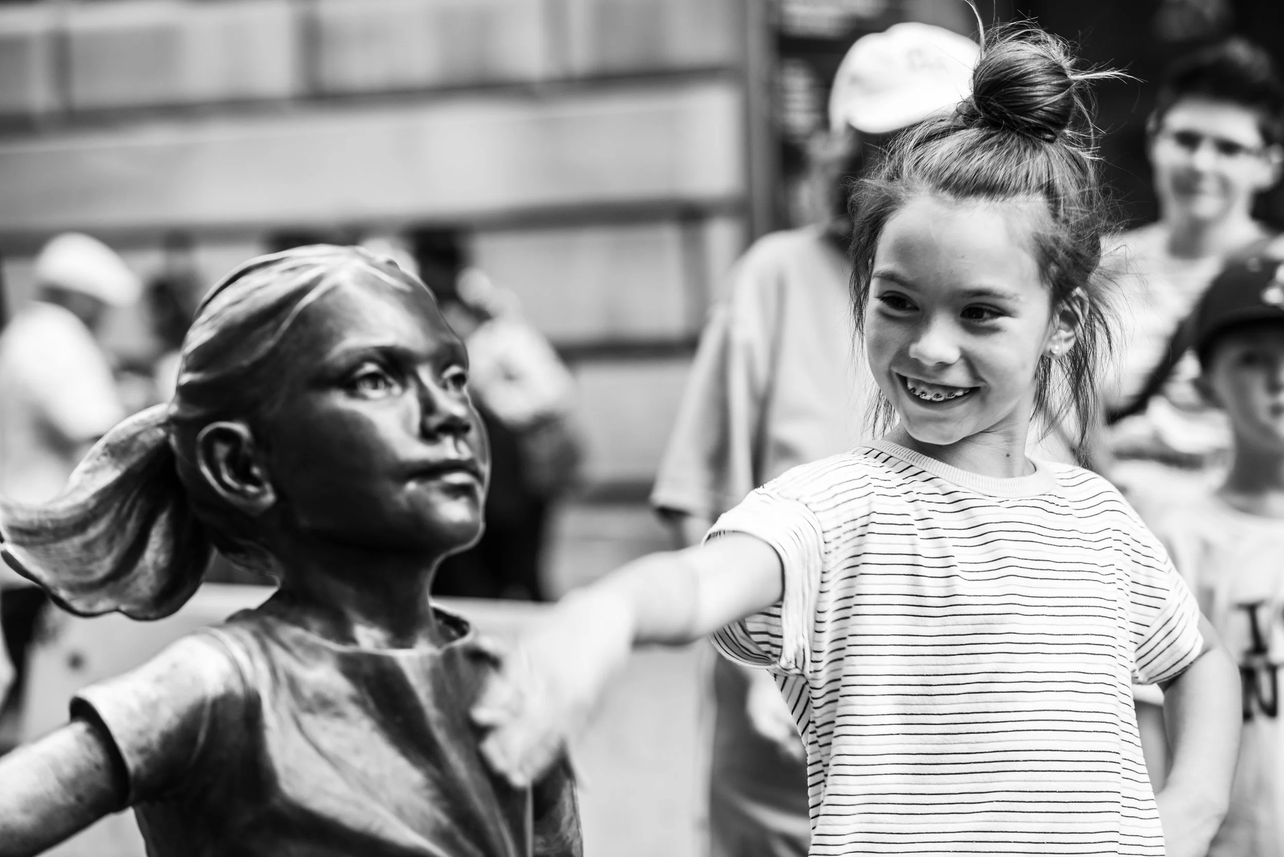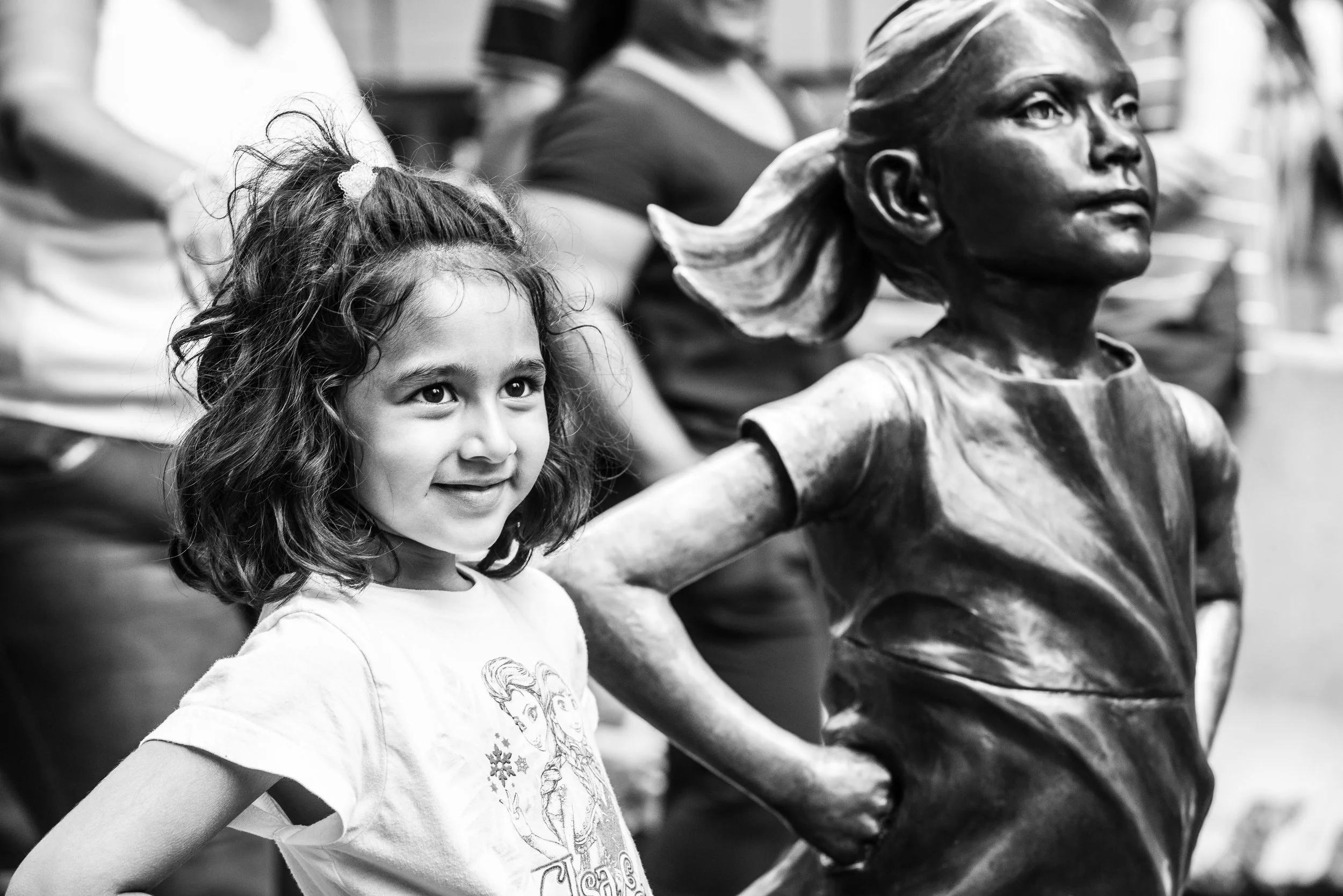 A young girl poses confidently side-by-side with the Fearless Girl.