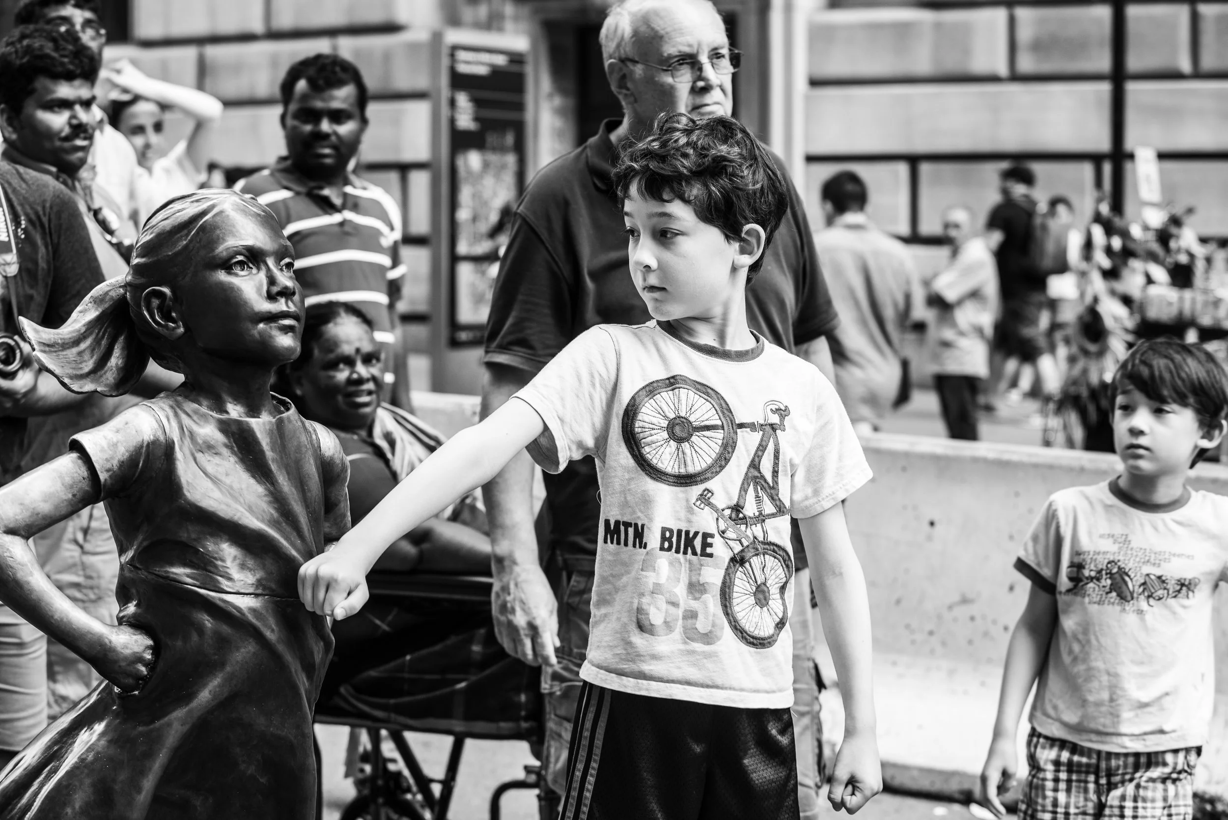 A brother and sister pose next to one another and the Fearless Girl. Teaching young boys to respect women - even statues - will progress the movement of equality for both genders.