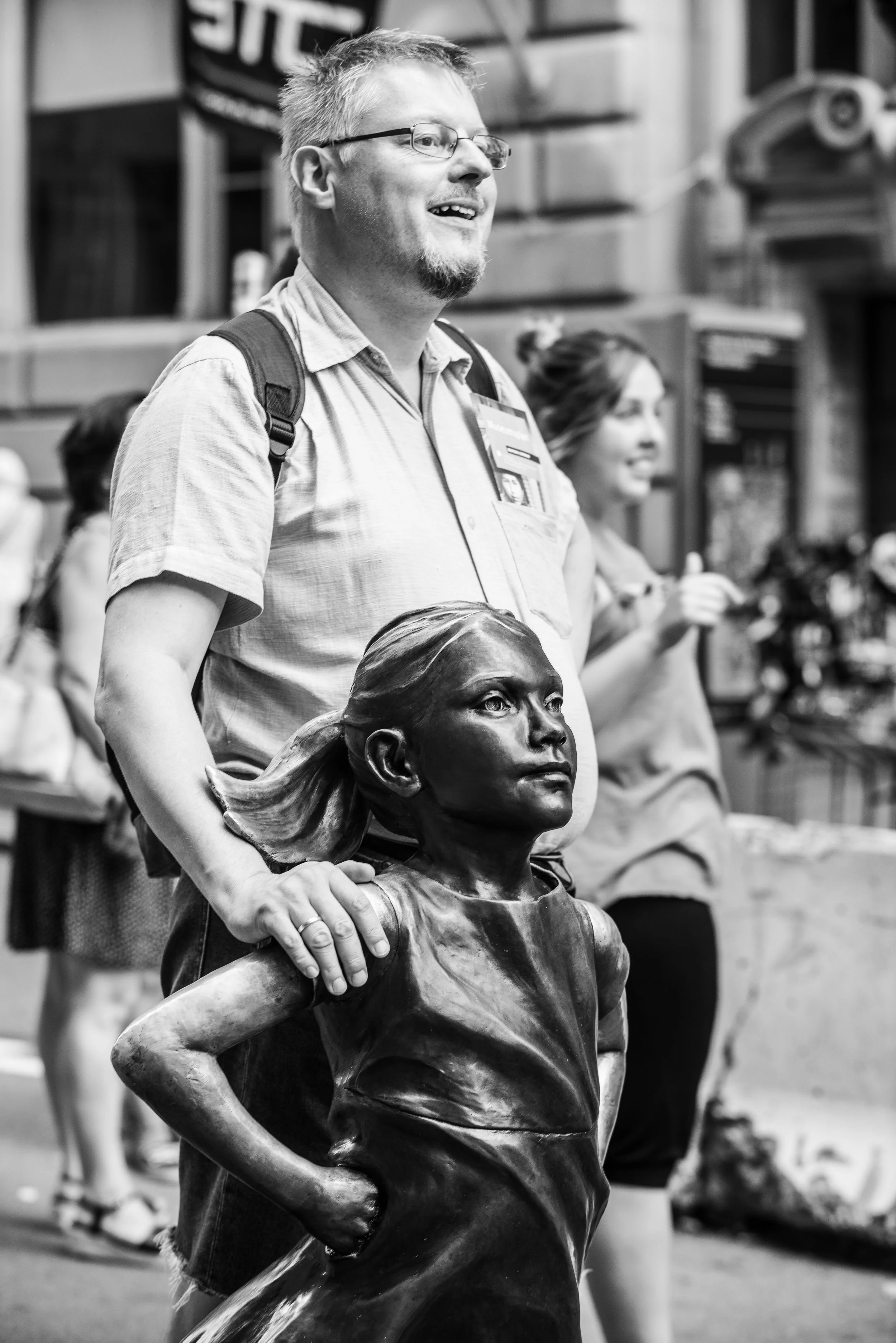 A middle-aged man stands behind the Fearless Girl with his hand on her shoulder. One of the few men that didn't put both hands on her shoulders or wrap his arms around her neck.