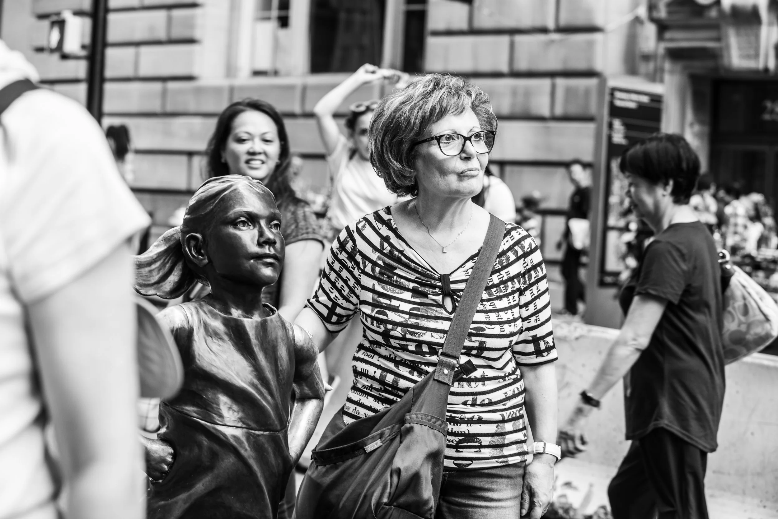 An older woman stares strikingly at her photographer while putting her hand inside the Fearless Girl's arm.