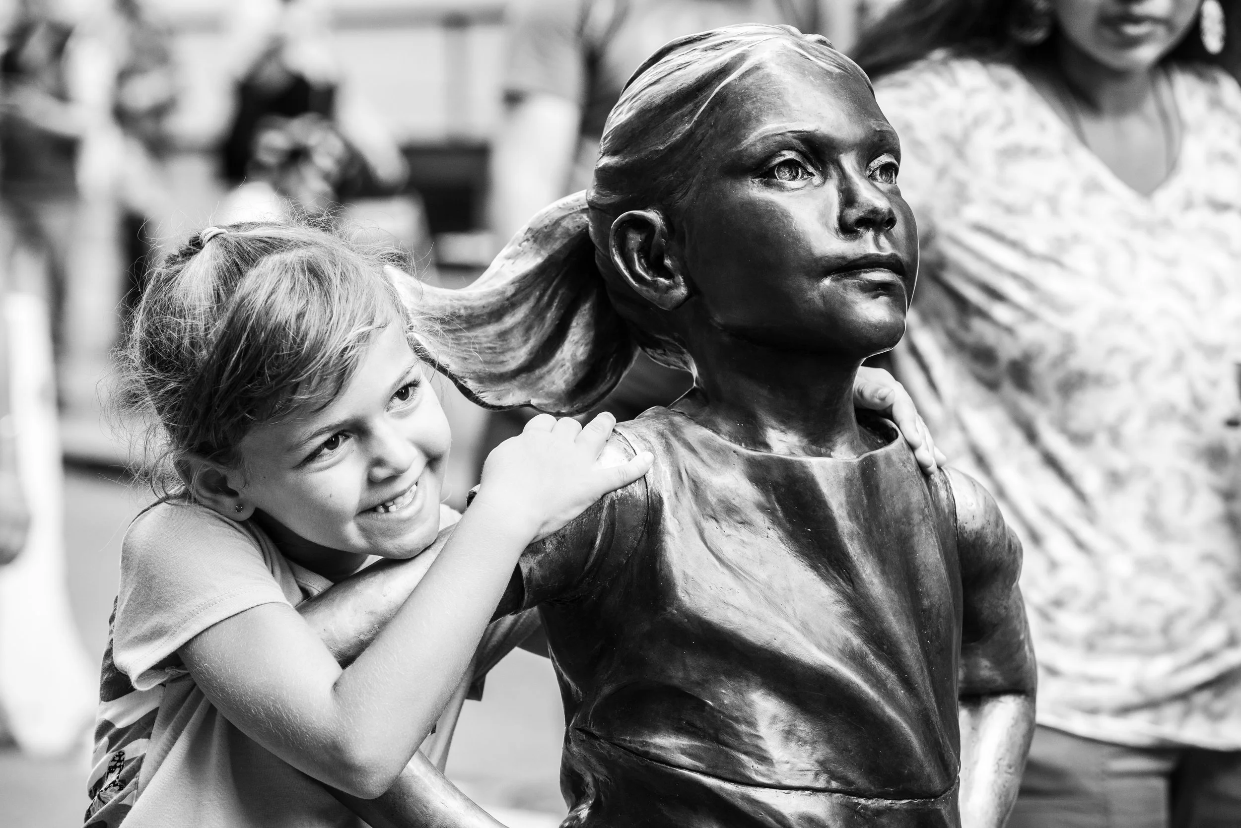 A young girl wraps her arms around the Fearless Girl's shoulders with a wide smile.